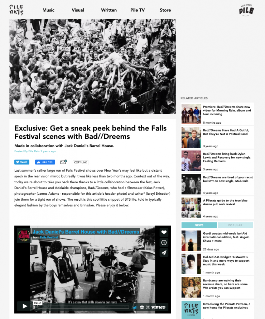 They partnered with Australian band Bad//Dreems to bring fans to the front row, travelling with the band across the country to all four Falls Festivals, capturing behind the scenes footage from the airport lounge, to the stage.