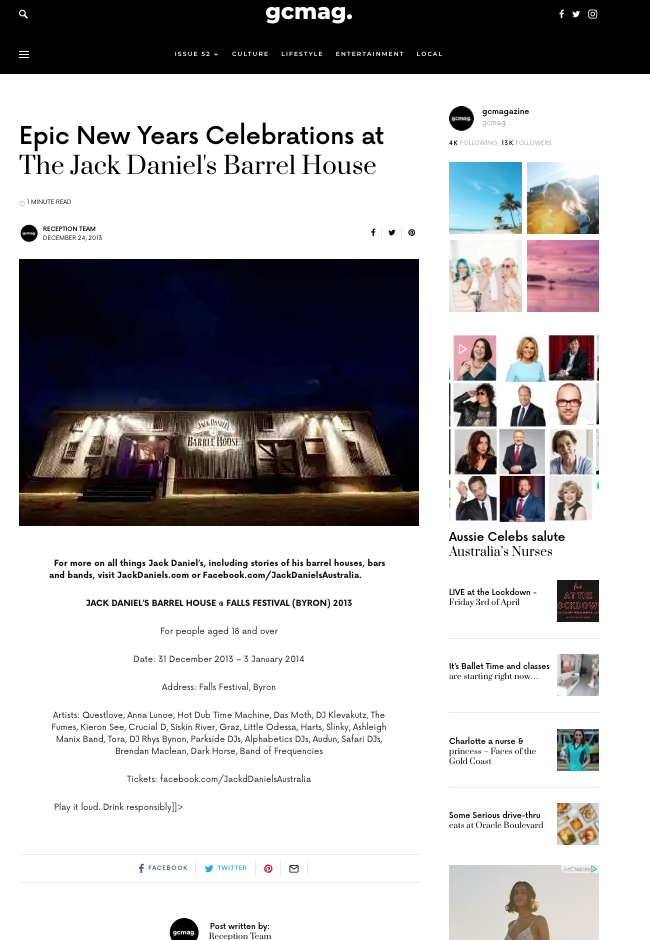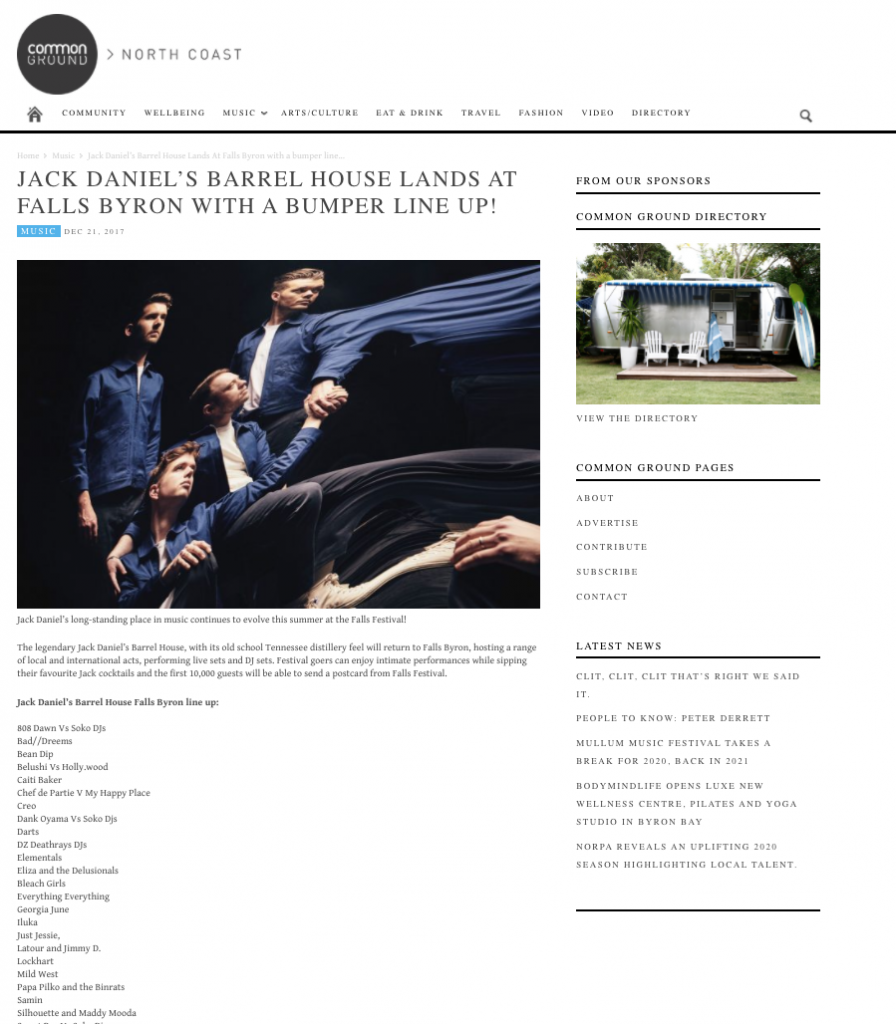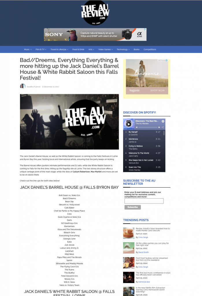 It was our honour to amplify Jack Daniel’s festival activations both on and off-site. Announcing the artist line ups and placing features on the construction of the structures pre-event. As well as hosting media events within the spaces on-site during the events, and ensuring there was plenty of post-event coverage with reviews and galleries.